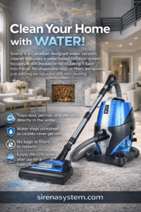 Sirena is a Canadian designed water vacuum cleaner that uses a water-based filtration system to capture dirt instead of recirculating it back into the air. No disposable bags or filters are required, just add regular tap water and start cleaning.